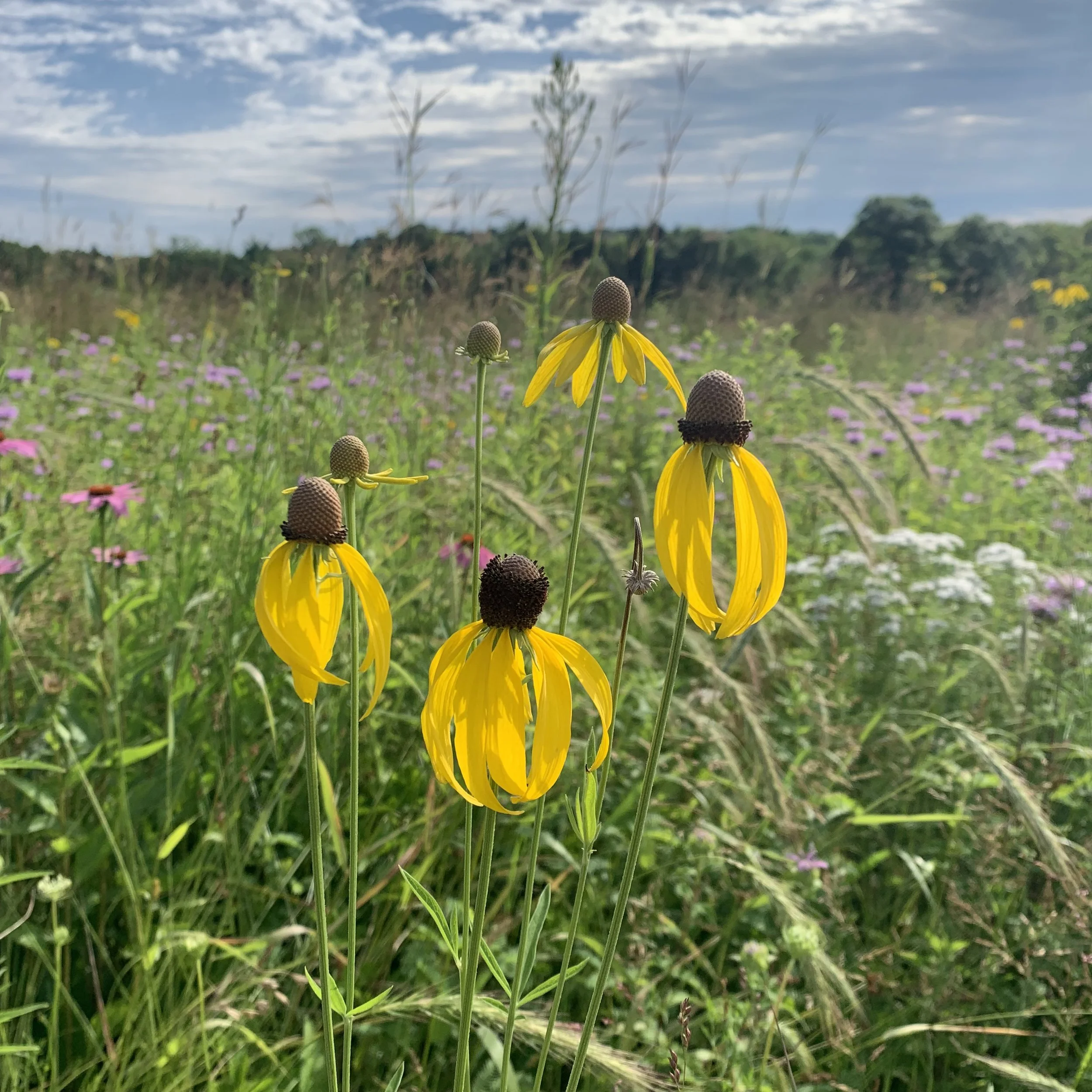 Tall blooms that rise like rockets with trailing yellow plumes in your garden. The gray cone turns brown when the bright yellow petals fade and provides food for birds in the fall and winter. A host plant for the Wavy-Lined Emerald moth.